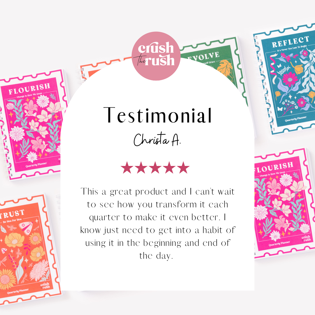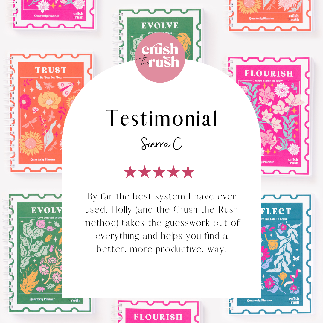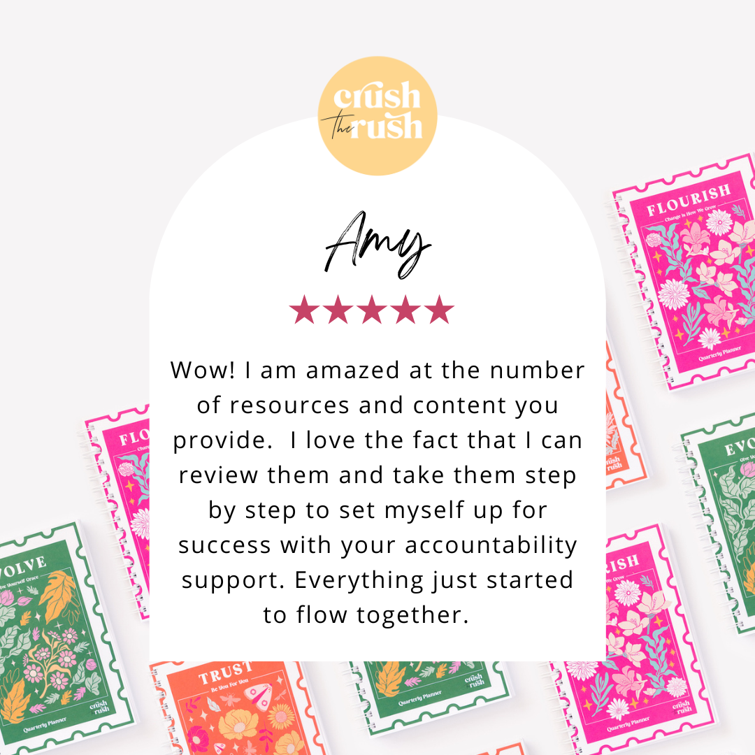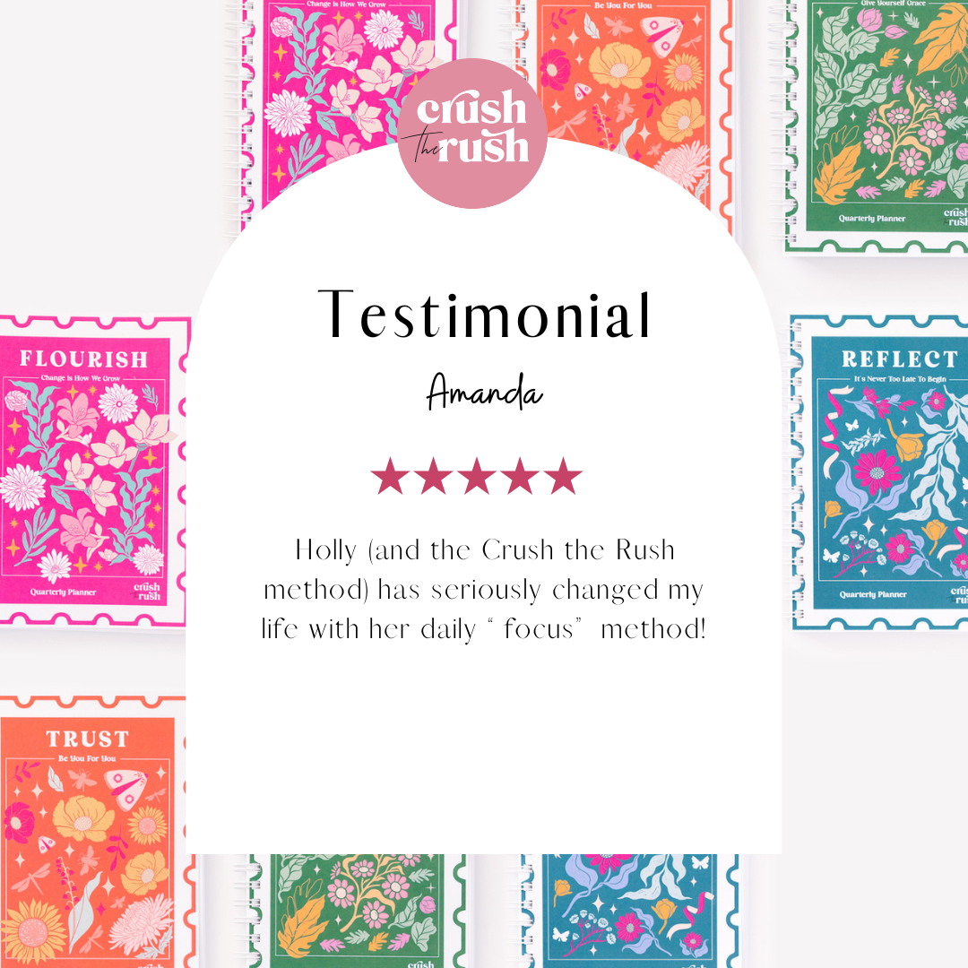 The Crush the Rush quarterly planner (and the community behind it) is the most powerful tool you will find when it comes to finding that time freedom you crave.